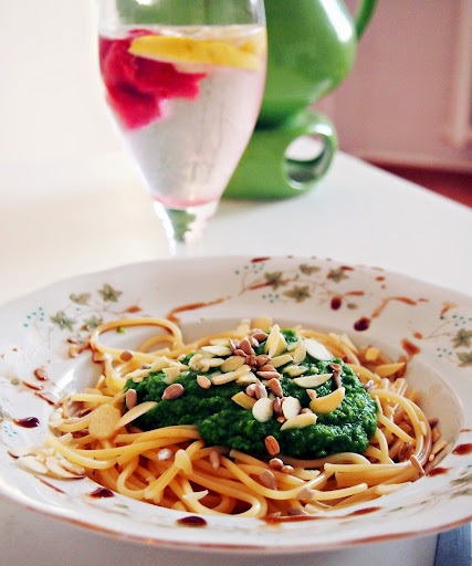 W Biedronce natrafiłam na jarmuż i bez zastanowienia wpakowałam do koszyka. Jarmuż bowiem jest bombą składników odżywczych. Co w nim jest? Przede wszystkim żelazo, wapń, witamina K, witaminy C, karotenoidy (β-karotenu, luteiny, zeaksantyny). Brokuł również ma mnóstwo wapnia i żelaza, a do tego potas i megadawkę witaminy C. Połączenie tych dwóch warzyw jest wręcz idealne dla wegan. Pastę robi się szybko, ma świetny smak, a podana z makaronem – aaa pycha!