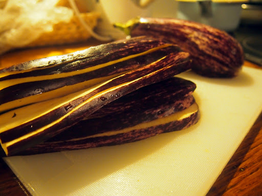 1. Bakłażana kroimy wzdłuż na cienkie plastry. Obsypujemy lekko solą i odstawiamy na 30 minut.