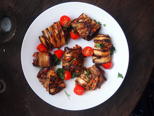 Grillowane, cienkie plastry bakłażana nadziane przyprawioną kaszą pęczak. Można je podać na ciepło lub na zimno – na liściach sałaty, ze świeżymi ziołami i pomidorkami cherry.