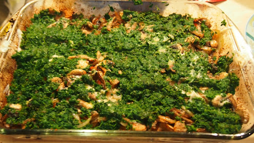 Teraz wykładamy pieczarki i cebulę. Potem szpinak.