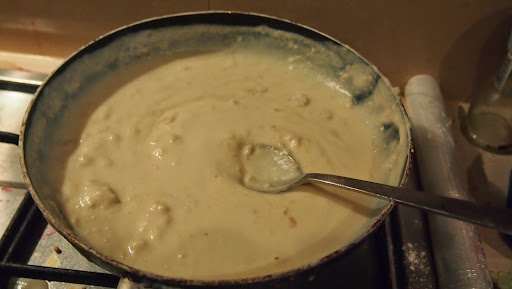 1. Rozgrzewamy olej na patelni. Następnie dodajemy do niego mąkę i szybko mieszamy. Widelcem rozdrabniamy, by pozbyć się grudek.