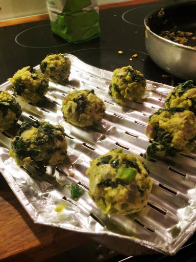 3. Gdy jarmuż będzie gotowy, zbieramy nadmiar wody. Dorzucamy groszek, próbujemy. Doprawiamy do smaku. Dodajemy płatki owsiane i mąkę i łyżkę oleju. Mieszamy. Formujemy kulki.