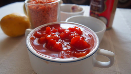 3. Wsypujemy soczewicę, dodajemy pomidory i zalewamy bulionem, Mieszamy. (przekładamy do dużego garnka)