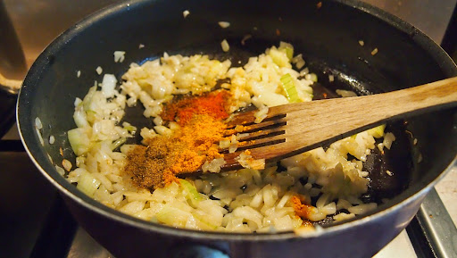 1. Cebulę kroimy w kostkę, czosnek miażdżymy – podsmażamy na oliwie aż cebula zmięknie i nabierze złotego koloru. (wszystko na patelni)