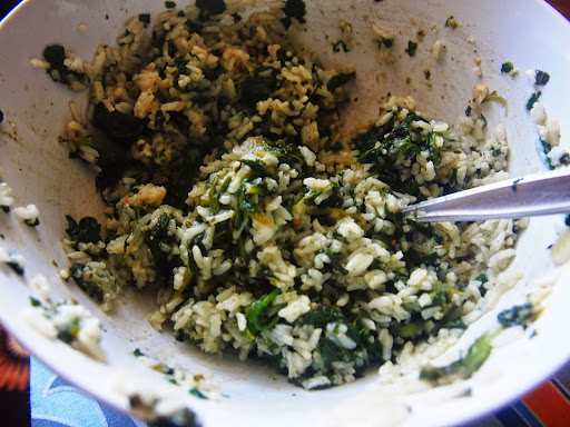 5. Do ugotowanego ryżu dodajemy szpinak z całą zawartością patelni, czyli także z wodą. Wszystkie mieszamy.