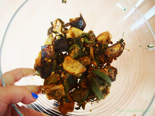 1. Pokrojone w talarki warzywa – seler, marchewkę, bakłażana i cukinię wrzucamy do woreczka do pieczenia, wrzucamy wszystkie przyprawy i kiełki. Pieczemy w zamkniętym woreczku około pół godziny. Następnie wszystko studzimy.